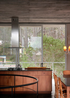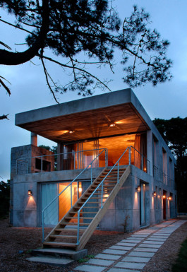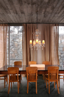 Esta casa de verano de 200 metros cuadrados se construye de forma compacta y cómoda, con la intención de ser energéticamente eficiente y de tener un coste de mantenimiento nulo. Rodeada de vegetación autóctona y cubierta con piedras de la zona, no necesita jardinería ni pinturas en los materiales. La utilización del hormigón armado, que tiene suficiente inercia para mantener fresco el interior, se combina con ambientes cálidos forrados de madera que aíslan la temperatura requerida dentro del hogar.