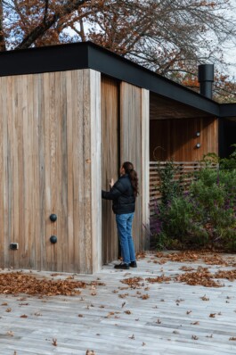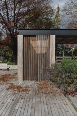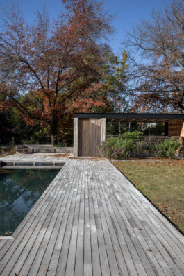 Se han elegido materiales que dialogan armónicamente con el paisaje: madera de lapacho sin tratar para los revestimientos exteriores, utilizada también en pérgolas, cercos y decks; hormigón visto y hierro pintado de negro en las estructuras expuestas, aportando un contraste contemporáneo. La piscina, revestida en su interior con un material oscuro, funciona como un espejo que refleja los árboles circundantes, evocando la imagen de un lago inmerso en la naturaleza.