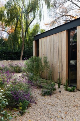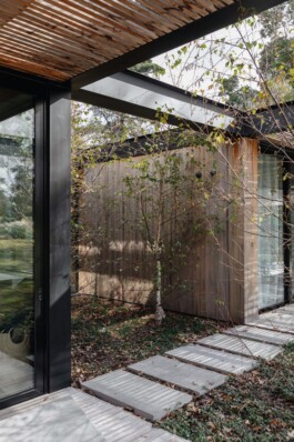 El frente de la vivienda está definido por tabiques de hormigón visto, realizados con encofrado de tablas verticales de 1,2 metros de alto, que se extienden hasta la línea de retiro. Esta solución genera un jardín cedido al entorno, un jardín intermedio entre el muro y la fachada, y un jardín interior que se proyecta hacia el corazón del terreno, promoviendo la circulación de aire y luz.