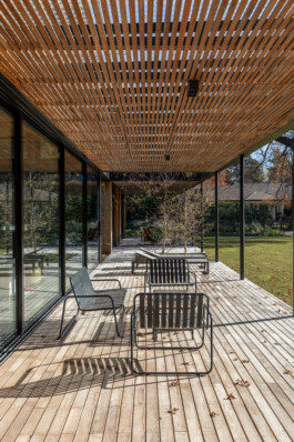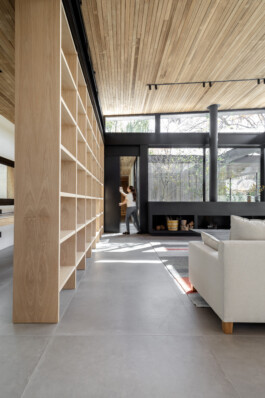 Con una superficie cubierta de aproximadamente 280 m2 y 120 m2 de galerías semicubiertas y permeables, la vivienda se desarrolla en una única planta con forma de “L”. Esta disposición no solo define el área del jardín, sino que también articula los espacios interiores, generando vistas cruzadas entre los distintos ambientes.