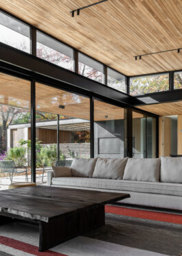 El diseño del living es uno de los aspectos más destacados de la casa: se presenta apaisado, con amplios ventanales que ofrecen una vista espectacular del jardín. Esta área se integra armoniosamente con el comedor, la cocina y el comedor diario. Sobre este espacio, un techo inclinado se eleva, sostenido por una estructura metálica y lucarnas que no solo aportan una sensación de amplitud, sino que también permiten una abundante entrada de luz natural.