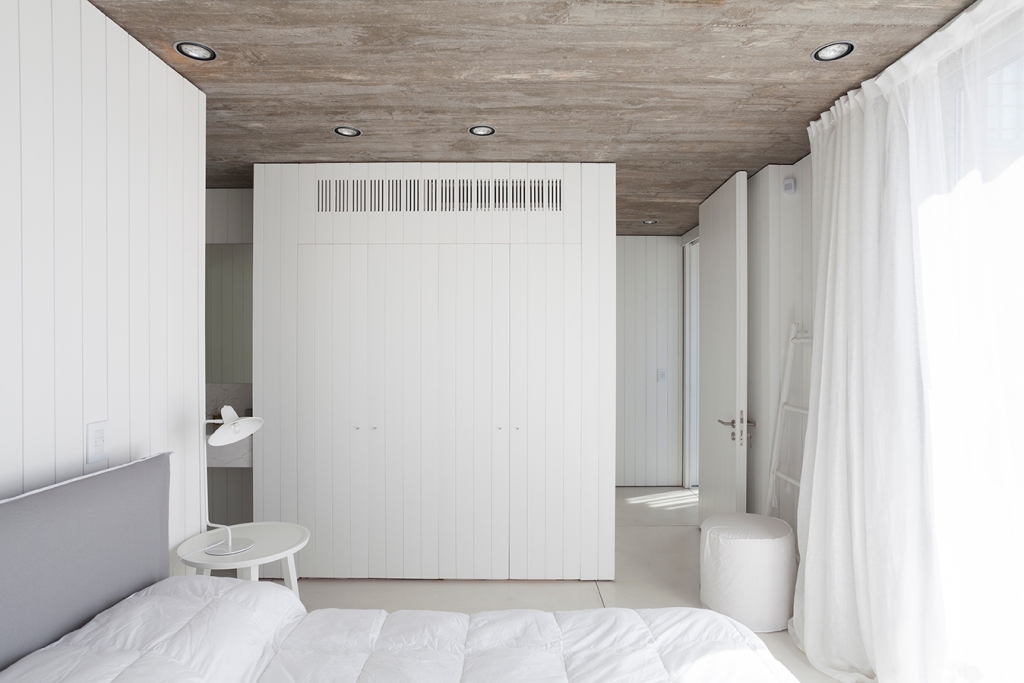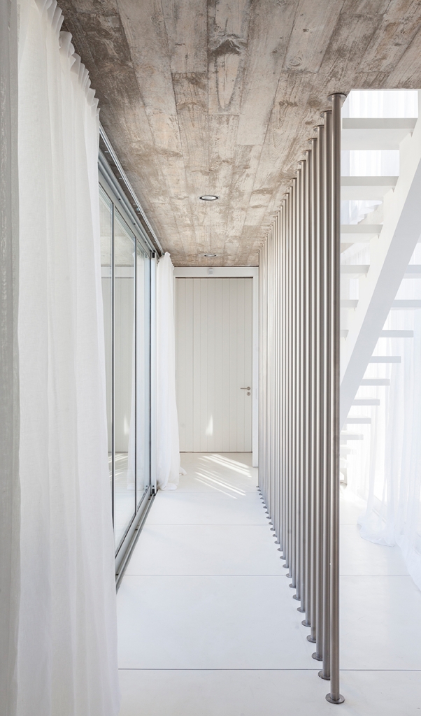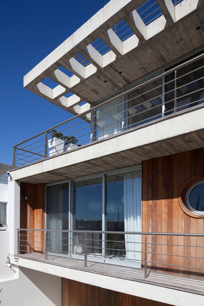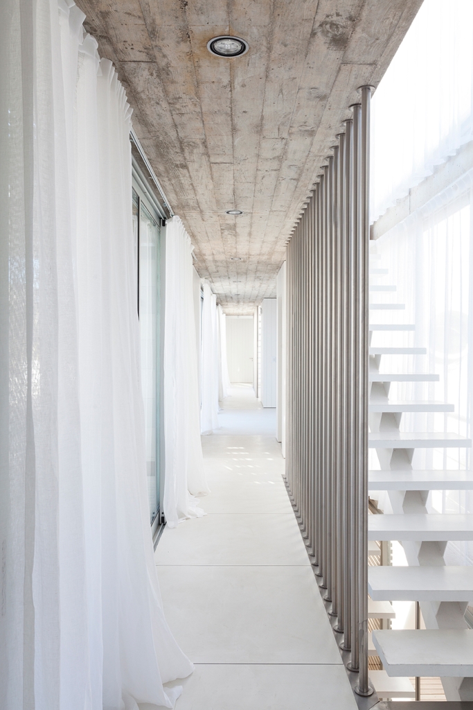 La vivienda usa en todo su potencial el área construible, y posee tres volúmenes principales enlazados por otros dos de menor tamaño, contenedores de las escaleras y el ascensor, vinculando la casa de forma vertical y horizontal. Así, el recorrido de la misma se va dando desde las zonas más sociales hacia las más íntimas en el interior.