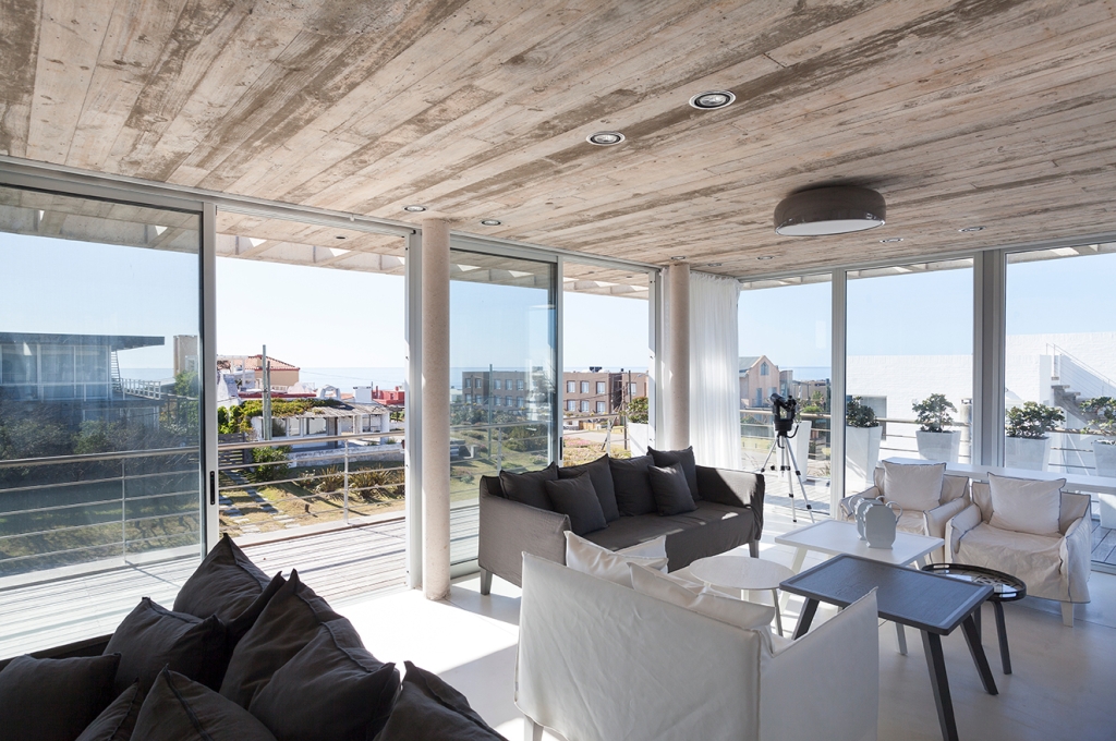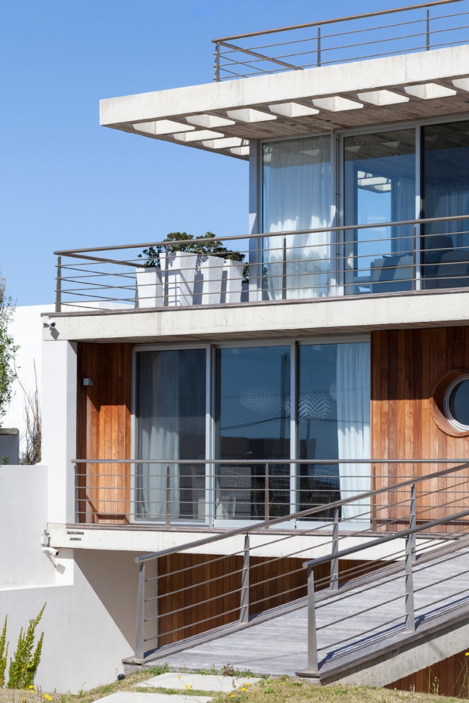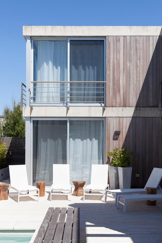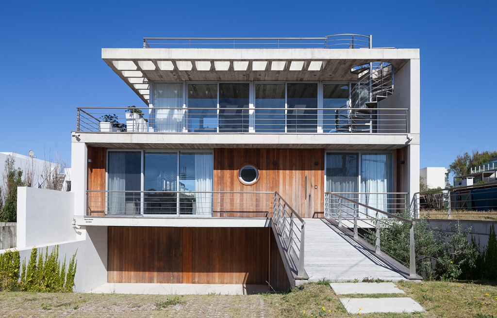 Como un tridente desplegado hacia el mar, Nautilus, se encuentra en una de las manzanas de Manantiales más próximas a la playa. Una rampa hacia la calle nos lleva a la entrada, de líneas rectangulares, donde se destaca el uso de la madera como revestimiento exterior, junto al hormigón y el aluminio. La fachada recuerda a la terraza de un barco, sensación que se acrecienta gracias al uso de ojos de buey por toda la casa y la escalera caracol que conduce al solárium. La casa en el interior se encuentra revestida en su totalidad en madera pintada blanca. Por su parte, los baños están lujosamente revestidos de mármol de marquina.