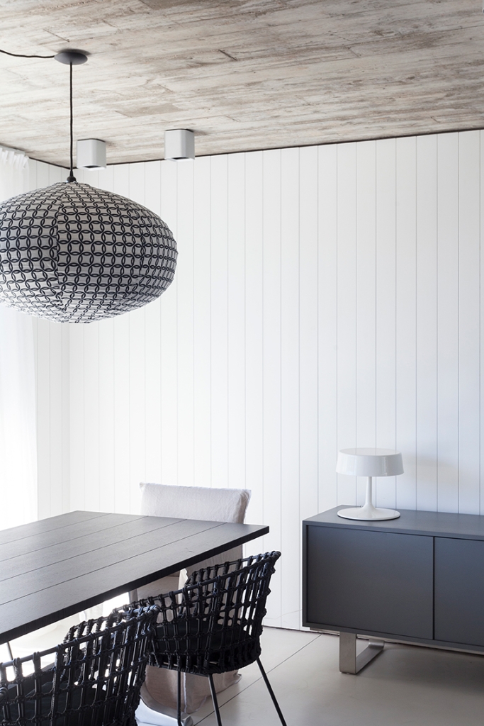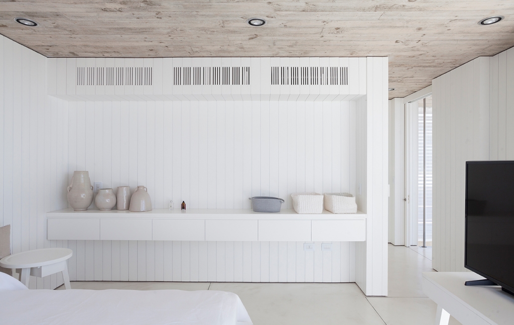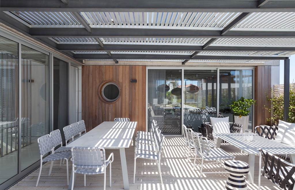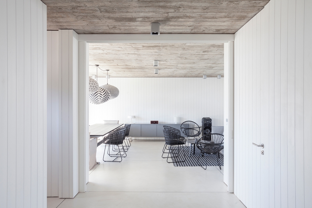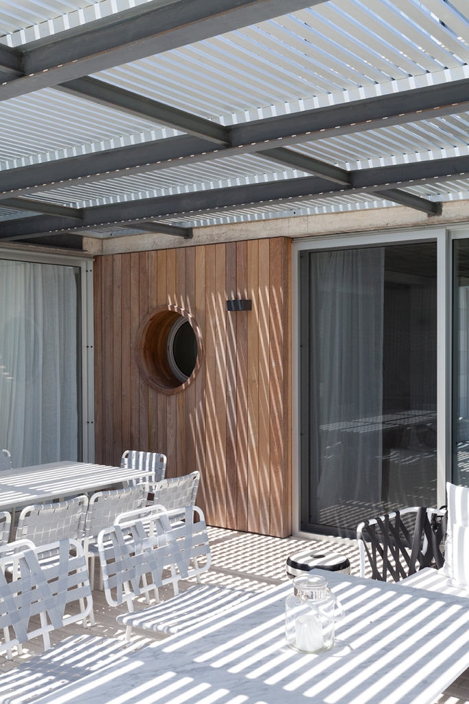 Como un tridente desplegado hacia el mar, Nautilus, se encuentra en una de las manzanas de Manantiales más próximas a la playa. Una rampa hacia la calle nos lleva a la entrada, de líneas rectangulares, donde se destaca el uso de la madera como revestimiento exterior, junto al hormigón y el aluminio. La fachada recuerda a la terraza de un barco, sensación que se acrecienta gracias al uso de ojos de buey por toda la casa y la escalera caracol que conduce al solárium. La casa en el interior se encuentra revestida en su totalidad en madera pintada blanca. Por su parte, los baños están lujosamente revestidos de mármol de marquina.