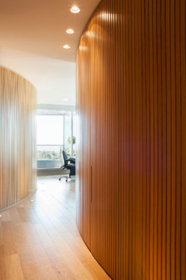 Todas las paredes de las oficinas son curvas y revestidas con varillas de madera, diseñadas por el estudio y realizadas a medida por los carpinteros, logrando un trabajo artesanal muy atractivo que en sí simula una estructura cerrada que contiene, por un lado, lugares de guardado y por otro, puertas que abren espacio a otros ambientes, como compartimentos independientes, generando en su totalidad, un piso entero rodeado de movimiento y amplitud en cada una de sus partes.