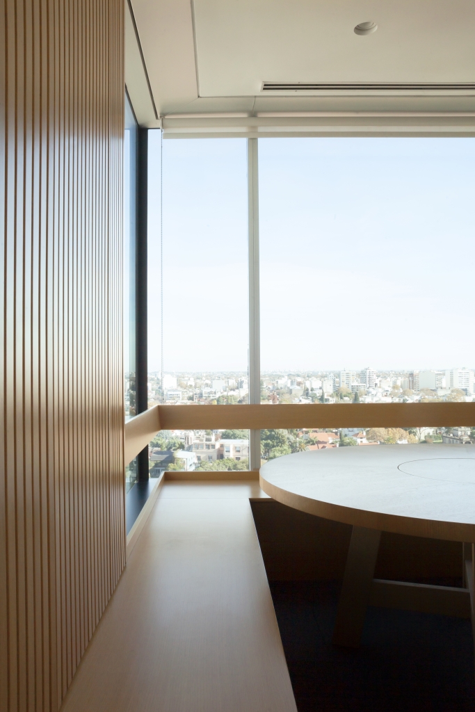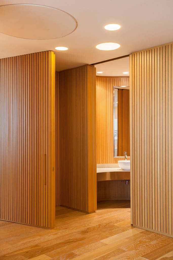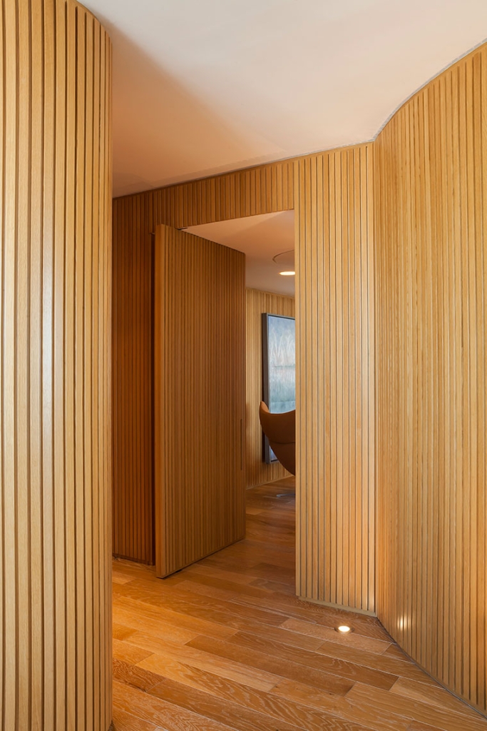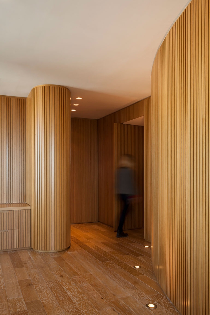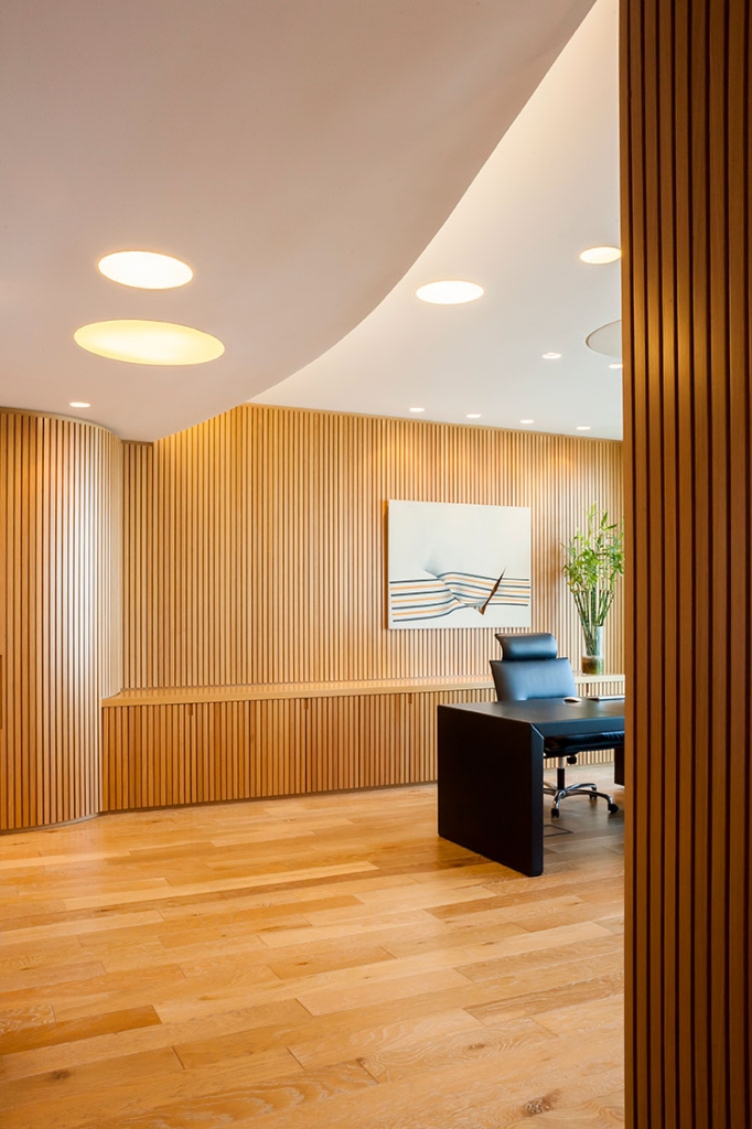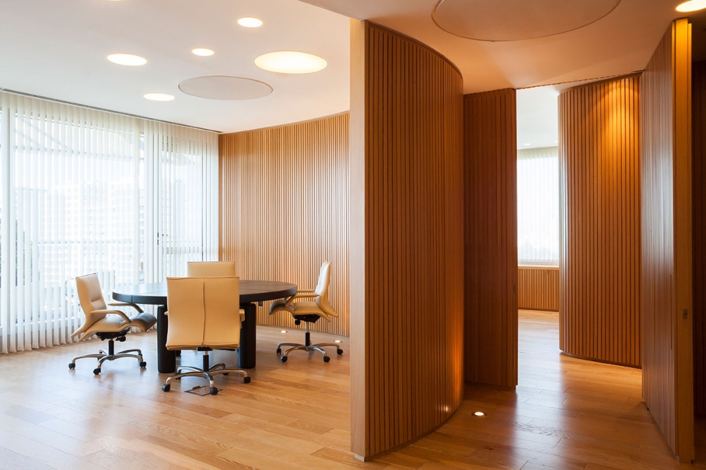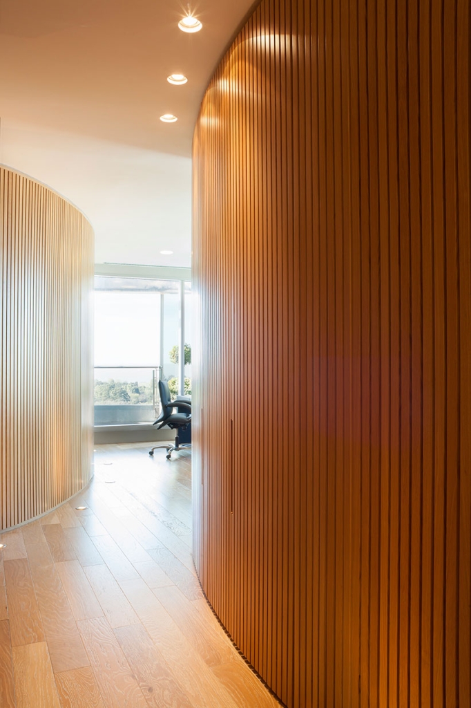 Todas las paredes de las oficinas son curvas y revestidas con varillas de madera, diseñadas por el estudio y realizadas a medida por los carpinteros, logrando un trabajo artesanal muy atractivo que en sí simula una estructura cerrada que contiene, por un lado, lugares de guardado y por otro, puertas que abren espacio a otros ambientes, como compartimentos independientes, generando en su totalidad, un piso entero rodeado de movimiento y amplitud en cada una de sus partes.
