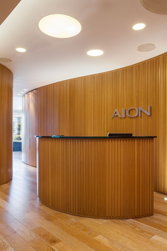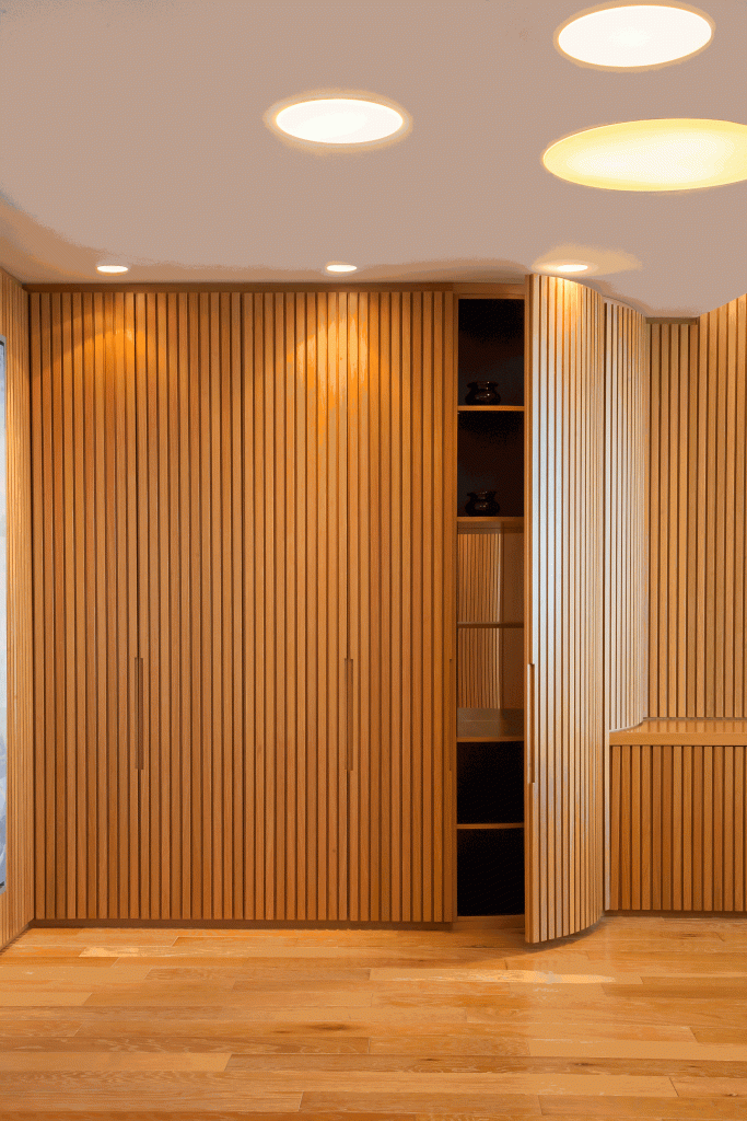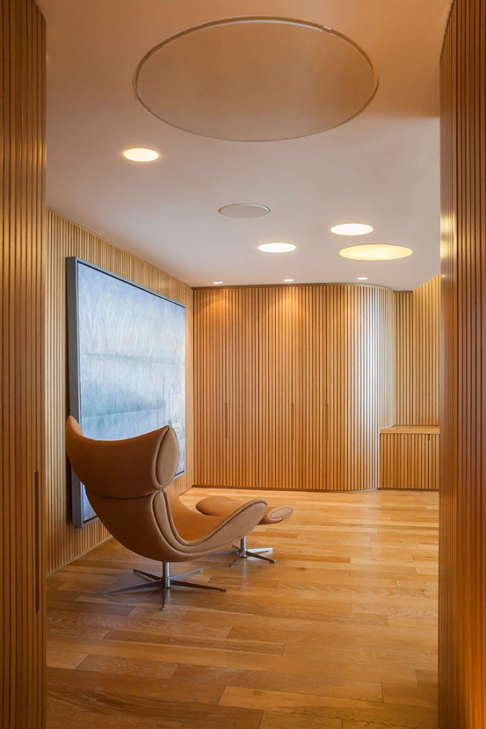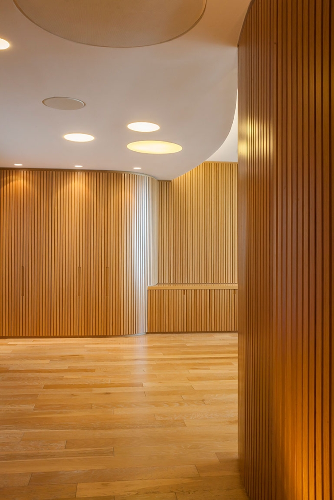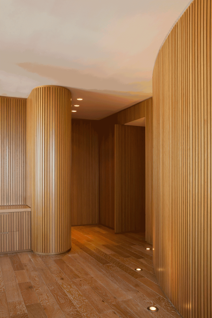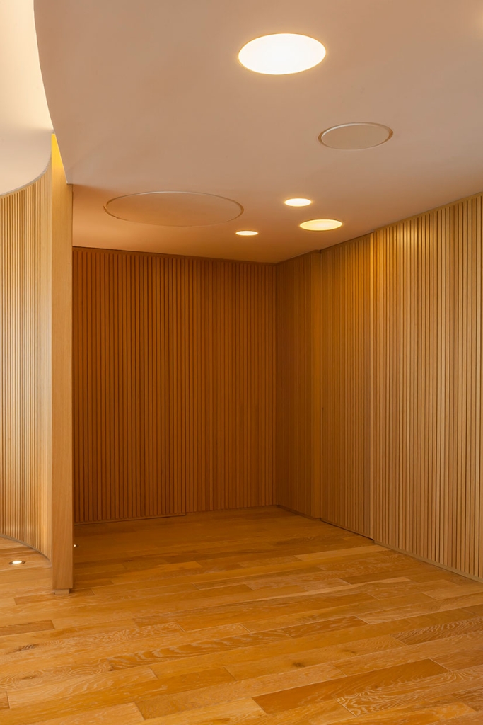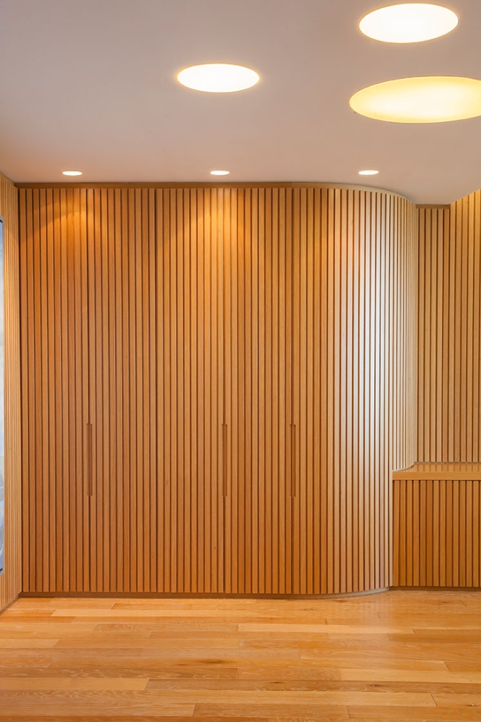 Todas las paredes de las oficinas son curvas y revestidas con varillas de madera, diseñadas por el estudio y realizadas a medida por los carpinteros, logrando un trabajo artesanal muy atractivo que en sí simula una estructura cerrada que contiene, por un lado, lugares de guardado y por otro, puertas que abren espacio a otros ambientes, como compartimentos independientes, generando en su totalidad, un piso entero rodeado de movimiento y amplitud en cada una de sus partes.