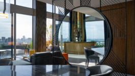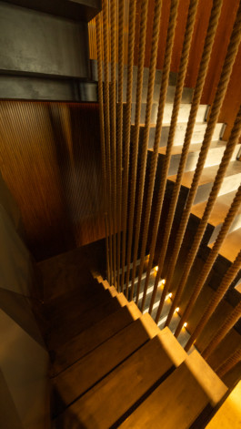 El departamento se extiende a lo largo de 620 m2, distribuidos en los tres últimos pisos de un edificio, ofreciendo una experiencia de vida como si se estuviera en un hotel, bien diferenciada por niveles. En el primer piso, se desarrolló la zona pública donde, además de una amplia cocina, encontramos un gran living con doble altura, un comedor elegante, un bar con una barra estilizada, y un escritorio funcional. Estos espacios están abiertos entre sí, pero divididos sutilmente por elementos personalizados, como un espejo gigante que funciona tanto como un divisor de espacios como un objeto de arte, aportando un toque de creatividad y distinción al ambiente. Una terraza complementa este nivel, expandiendo el espacio hacia el exterior y permitiendo disfrutar de un entorno al aire libre.