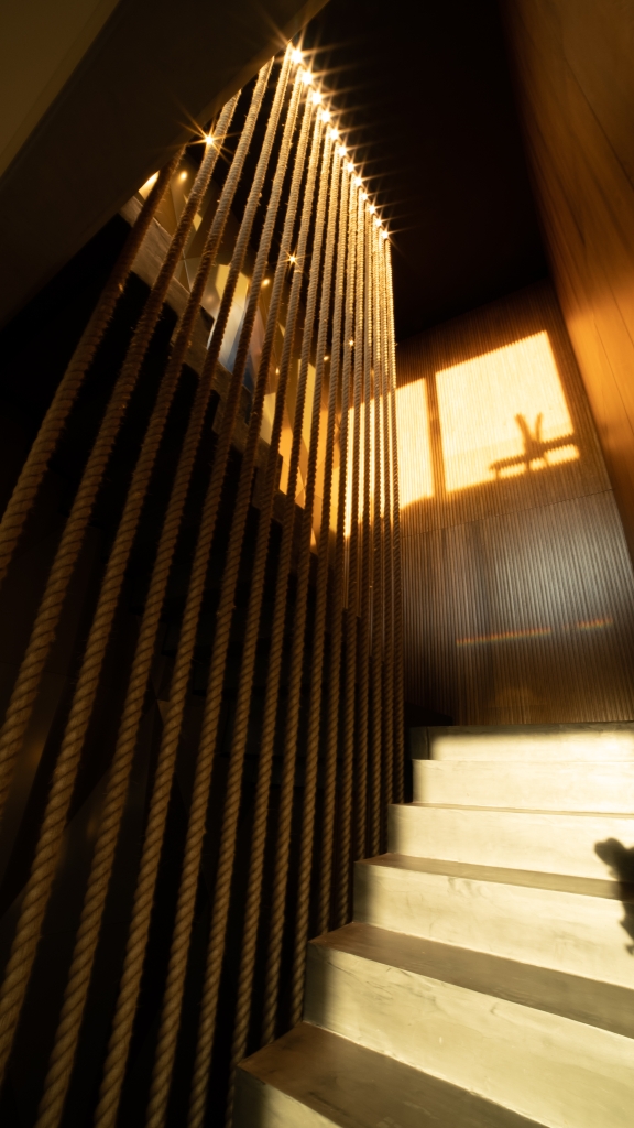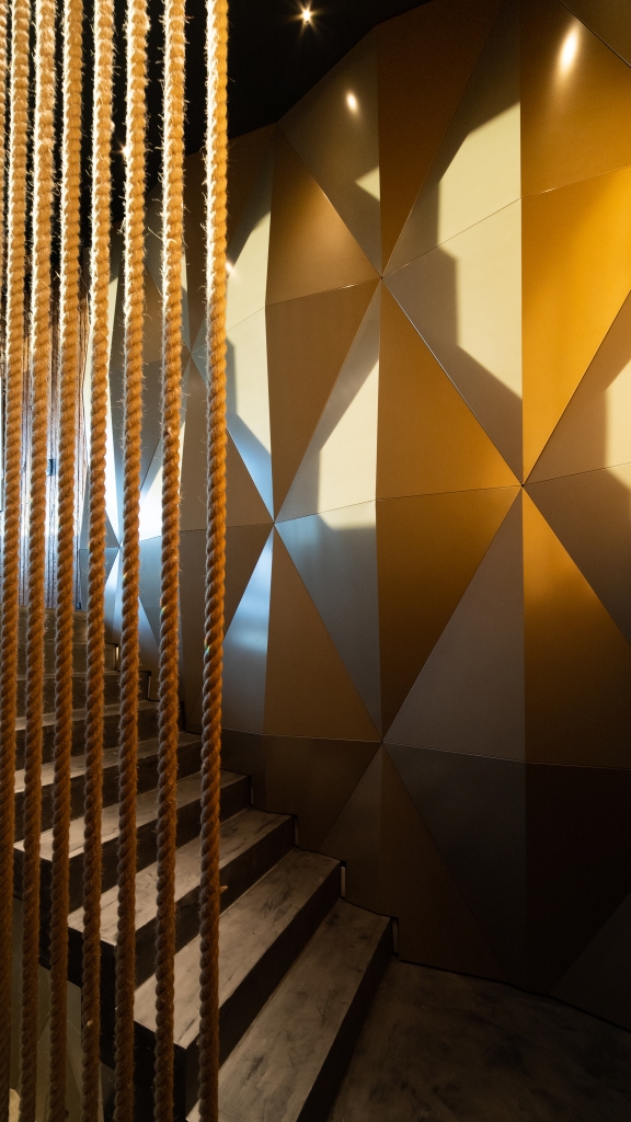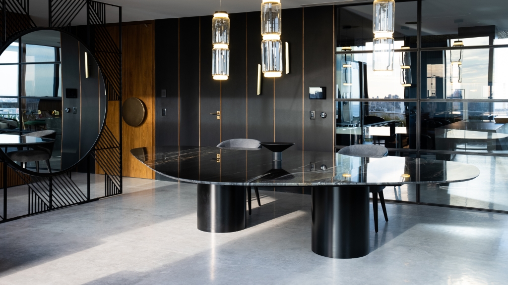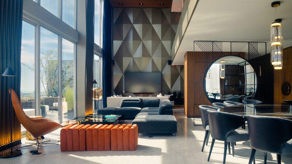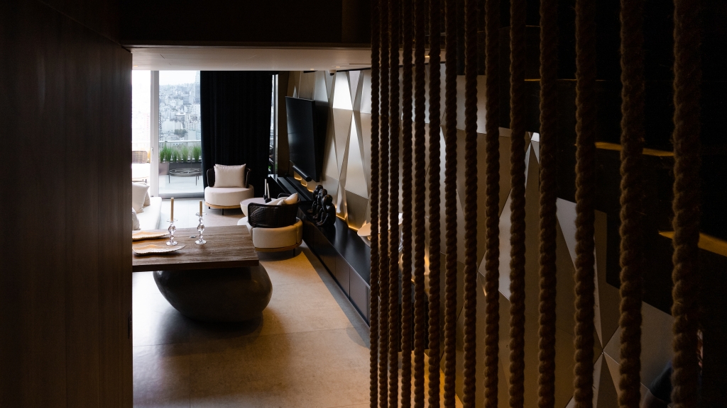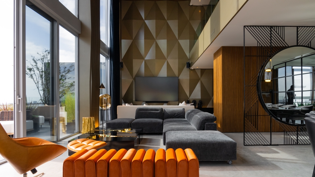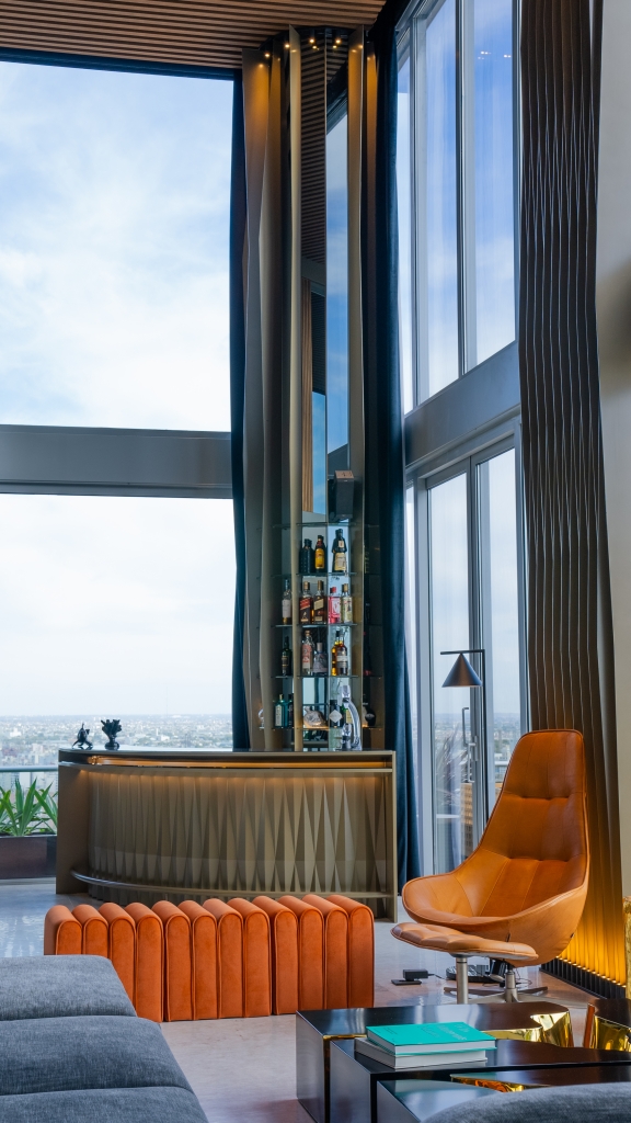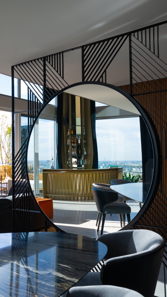 El departamento se extiende a lo largo de 620 m2, distribuidos en los tres últimos pisos de un edificio, ofreciendo una experiencia de vida como si se estuviera en un hotel, bien diferenciada por niveles. En el primer piso, se desarrolló la zona pública donde, además de una amplia cocina, encontramos un gran living con doble altura, un comedor elegante, un bar con una barra estilizada, y un escritorio funcional. Estos espacios están abiertos entre sí, pero divididos sutilmente por elementos personalizados, como un espejo gigante que funciona tanto como un divisor de espacios como un objeto de arte, aportando un toque de creatividad y distinción al ambiente. Una terraza complementa este nivel, expandiendo el espacio hacia el exterior y permitiendo disfrutar de un entorno al aire libre.